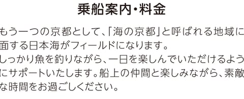 もう一つの京都として、「海の京都」と呼ばれる地域に面する日本海がフィールドになります。 しっかり魚を釣りながら、一日を楽しんでいただけるようにサポートいたします。船上の仲間と楽しみながら、素敵な時間をお過ごしください。 舞鶴タイラバ船 舞鶴ジギング船 丹後ディープタイラバ 舞鶴イカメタル 丹後ジギング